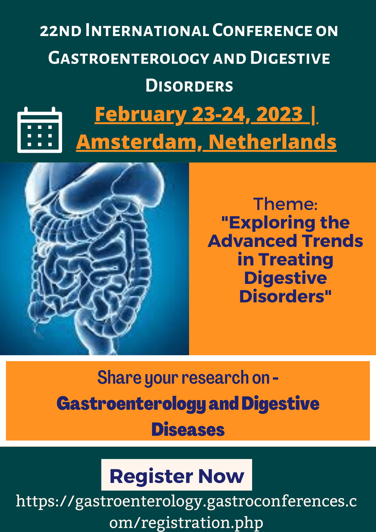 ME Conferences takes the privilege to welcome the participants from all over the world to attend the “22nd International Conference on Gastroenterology and Digestive Disorders” to be held during February 23-24, 2023 at Amsterdam, Netherlands. This Gastro Meet 2023 Conference will focus on the theme “Exploring the Advanced Trends in Treating Digestive Disorders” that provides a global platform to discuss about the present and future challenges across Gastroenterology, Digestive Disorders, Pediatric Gastroenterology and Nutrition, Advancements in Digestive Diseases etc.