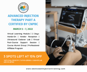 West Coast Injection Training (formerly Prolotherapy Training Canada) is excited to announce our second CCHPBC certified AIT course for peripheral joints, March 5th to 7th in Vancouver. We offer evidence-based, safe, effective injection training that will help you build a successful injection therapy practice using PRP, hyaluronic acid, corticosteroids and prolotherapy. New to our course is an ultrasound guided injection cadaver lab, a great opportunity to hone your ultrasound and injection skills. Discounts and all the details highlighted in our infographic with a guided tour by Dr. Alex Del Duca which you can watch here